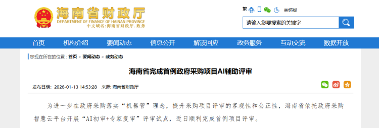 下一步,海南省将以此次试点为契机,认真复盘“AI初审+专家复审”过程,总结经验后逐步在符合条件的政府采购项目中推广,为政府采购项目规范评审注入新动能。