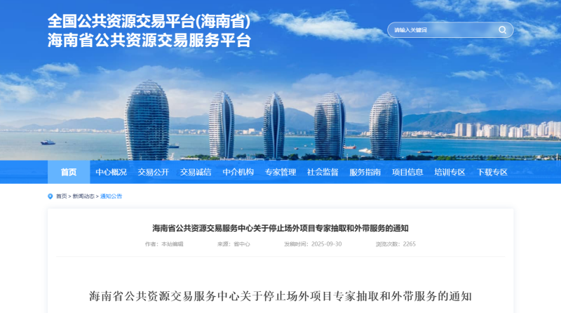 海南省公共资源交易服务中心关于停止场外项目专家抽取和外带服务的通知