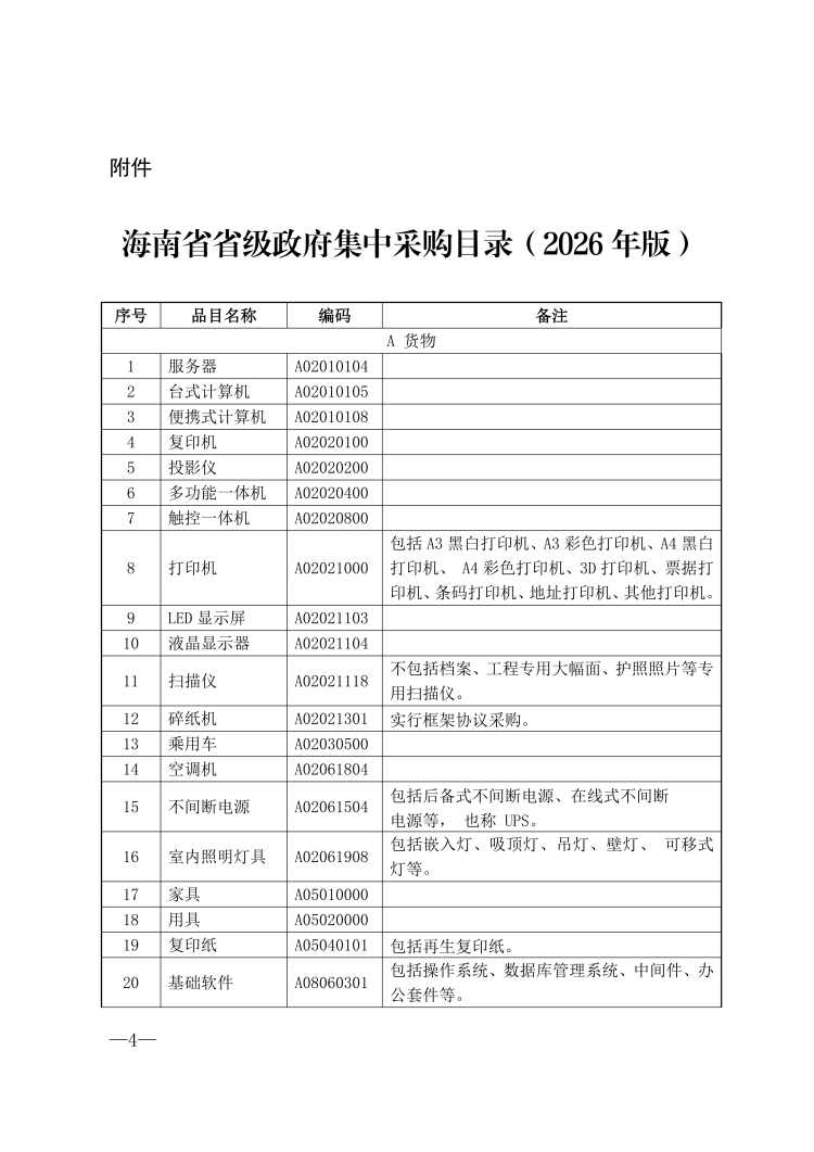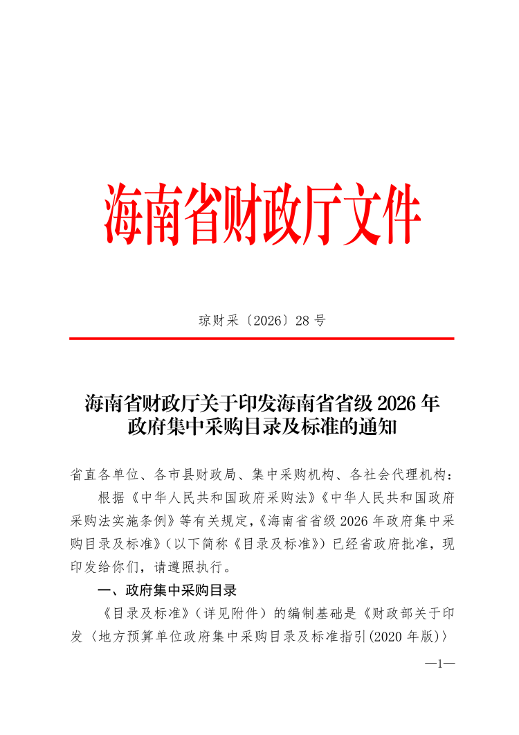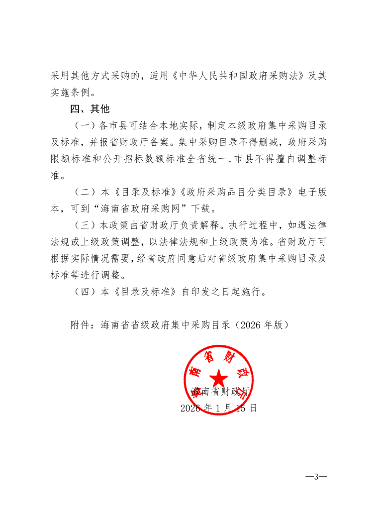 海南省财政厅关于印发海南省省级2026年政府集中采购目录及标准的通知